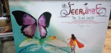 Poster with a giant butterfly on it which flaps its wings! We built a simple motorized mechanism to make the butterfly flap its wings. We developed it on behalf of a movie team, for promoting a Kannada Children's film "Jeerjimbe".