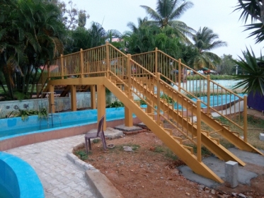 This metal structure, engineered wood bridge is built in GRS Fantasy Park, a water theme park. The bridge uses specially made Engineered wood that is water, weather and termite proof. Design ensures safety and long life as well.