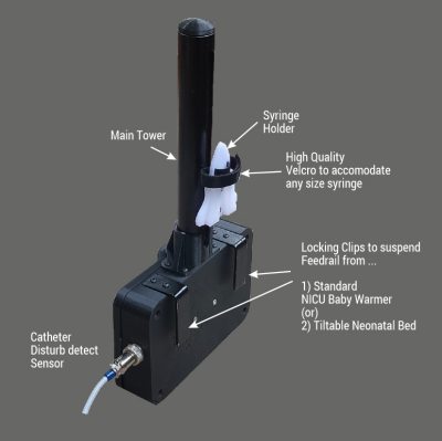 Neonatal Feedrail is an Automated Gavage Feeding Assist device that clips on to any Baby warmer in NICU (or) can be used with Optional Accessory “Tiltable Neonatal Bed”.