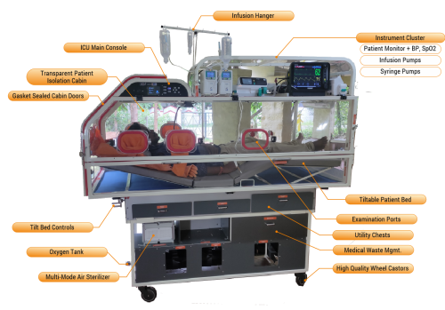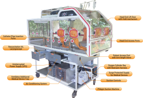 Pod-ICU is inspired by Pod-hotels, small, sleek and loaded with all features type of hotels in congested areas of large cities. The Pod-ICU is a similar unit but a fully equipped one bed Isolation ICU that can be transported anywhere and commissioned within 10 minutes!