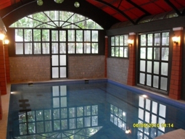 This novel Indoor swimming pool was built as a Low cost design, yet aesthetically appealing concept and to make its running also low cost, and environment friendly, it is fed with rain water harvested from the building next to it! A normal good monsoon, the pool can be filled fully!