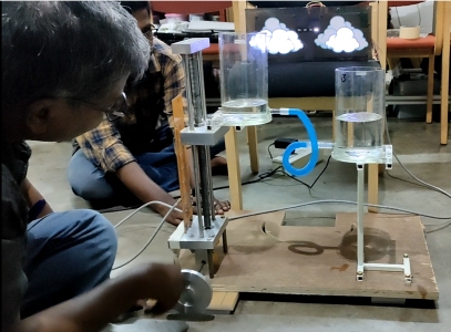 In this interactive exhibit, students/visitors can elevate liquid in a beaker and observe the flow of water from higher to lower potential, along with seeing the same explained in an illuminated poster as well.