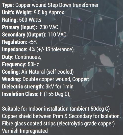 High quality transformer that can be used with imported Oxygen Concentrators that operate at 110V AC. Made from high quality copper, this transformer can be used continuously with medical equipment.